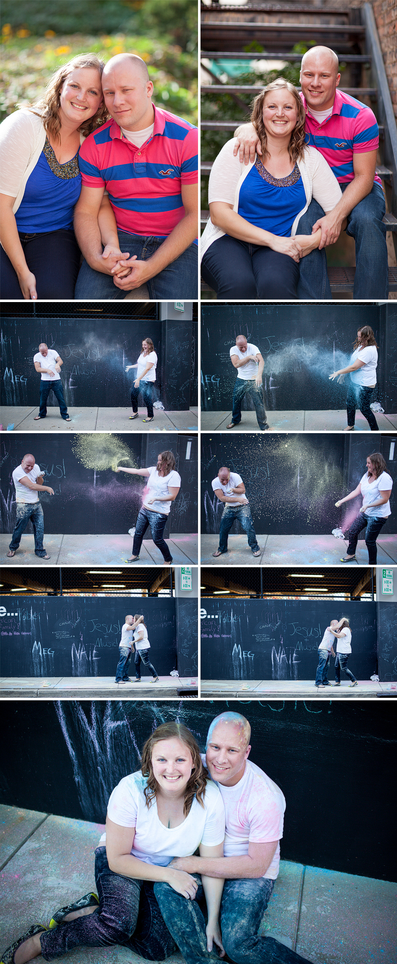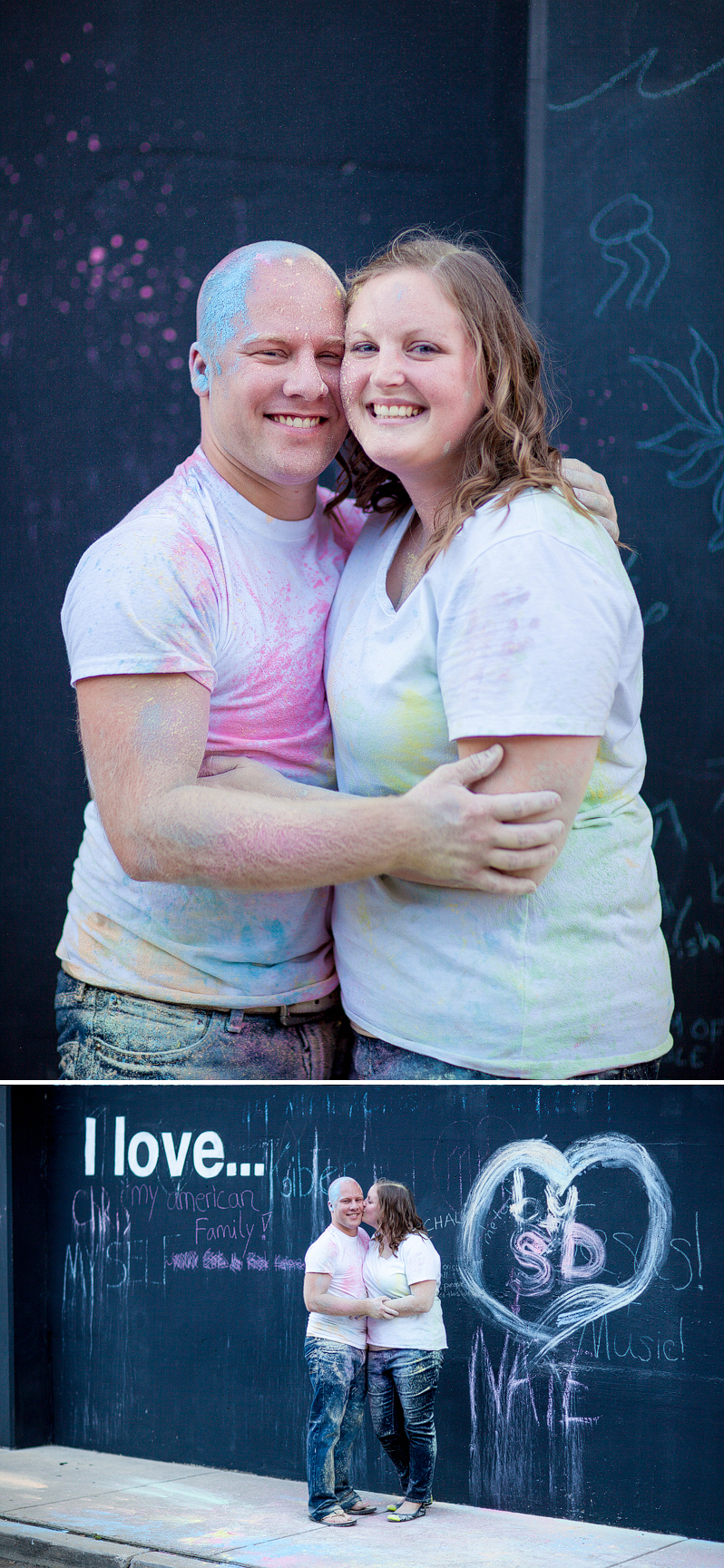 Sara and Brian are awesome. I’m so excited for their wedding in just a few months! We met up this past weekend in Downtown South Bend for an extremely fun engagement session. Not only were we able to take advantage of some amazingly cool spots in DTSB (I LOVE the new mural), but the chalk wall made a perfect backdrop for a friendly little chalk fight to end the session! It really was a fun way to end the weekend!